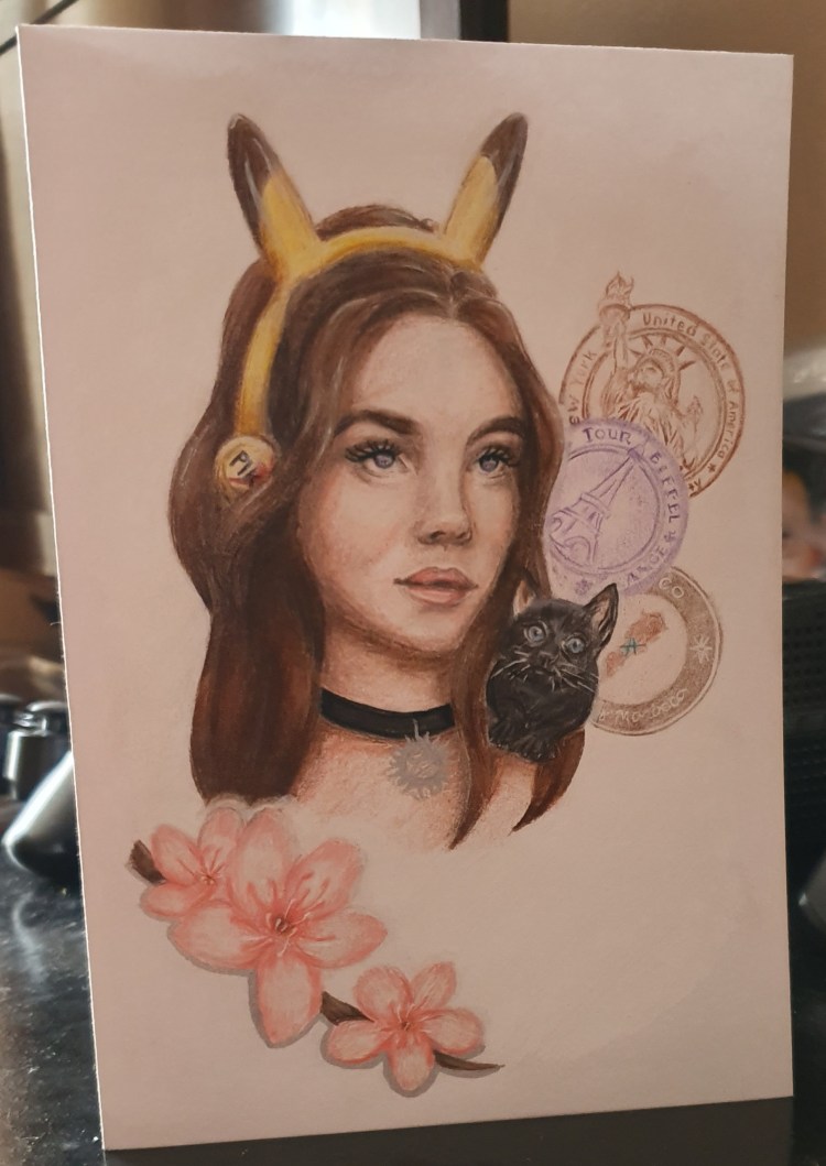 I drew the cherry blossoms because they are my favourite flower and I thought they would look pretty but this left the picture unbalanced so I drew some stamps from different countries behind her. I had the idea of drawing some from all around the world because I really want to travel it all but felt it made the picture too busy. I settled on the three I did because they are places I have been. I tried to keep them pale so as to draw away from the portrait and make them sit firmly in the background. I think that they add a postcard type of aspect to it too.