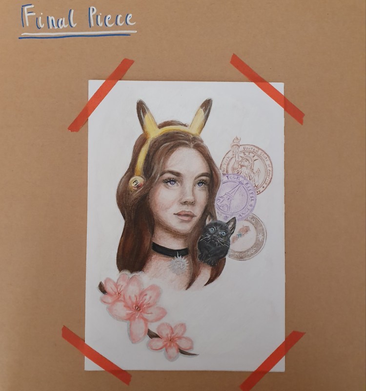 For the piece I drew on an a4 piece of paper and used pencils and ink. I use them most and they are what I feel most comfortable with. Over all I am happy with the piece, though I feel the pencil could have blended better. Also I think the hair makes the head look to long or pointy. I think I managed to include alot about me and not make it seem cluttered, though maybe I should have included different things. Explored deeper. Though I’m not sure how I would have displayed it if I had.
