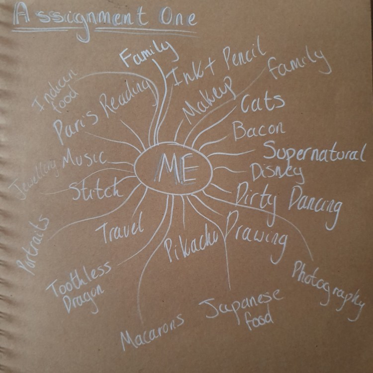 My second thought was that there should be a cat, though I did toy around with some ideas that didn’t involve one. I started with a spider diagram of things about me, though I did miss some things out. I included things that I like (though some weren’t really relevant to the task), what materials I like to use and use often and what I like to draw.