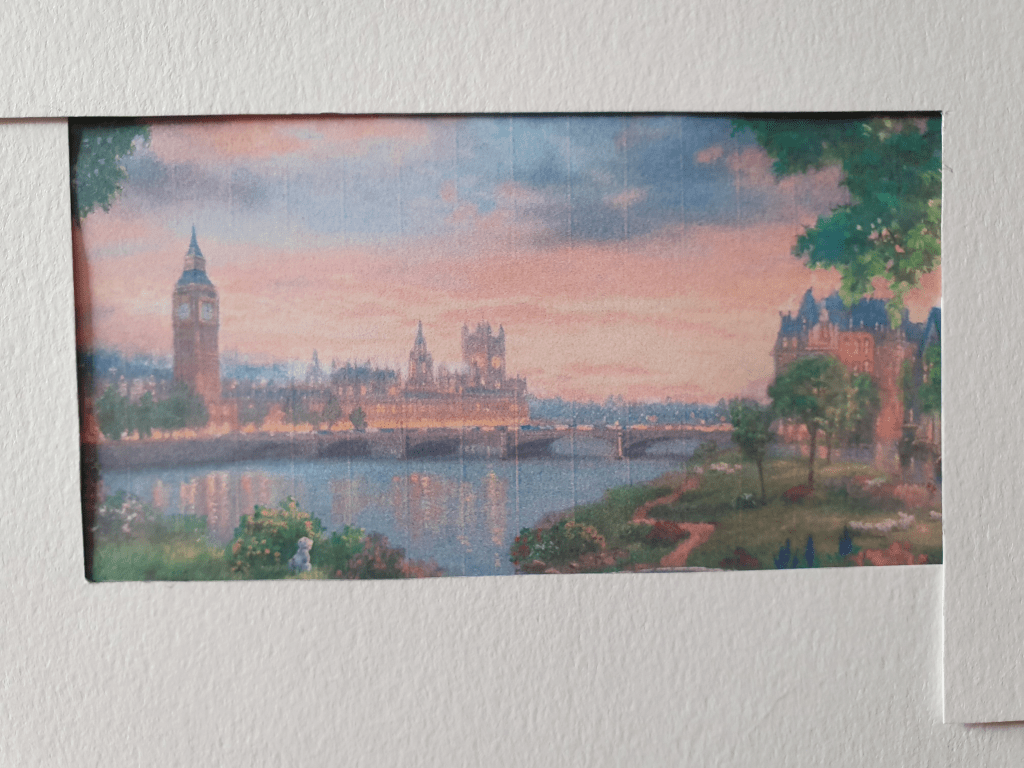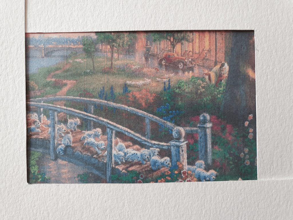 For this exercise I chose to use a painting created by Thomas Kinkade. Kinkade is well known for his Disney art and I picked a painting based on the movie 101 Dalmatians. I picked this as the image is full of activity.