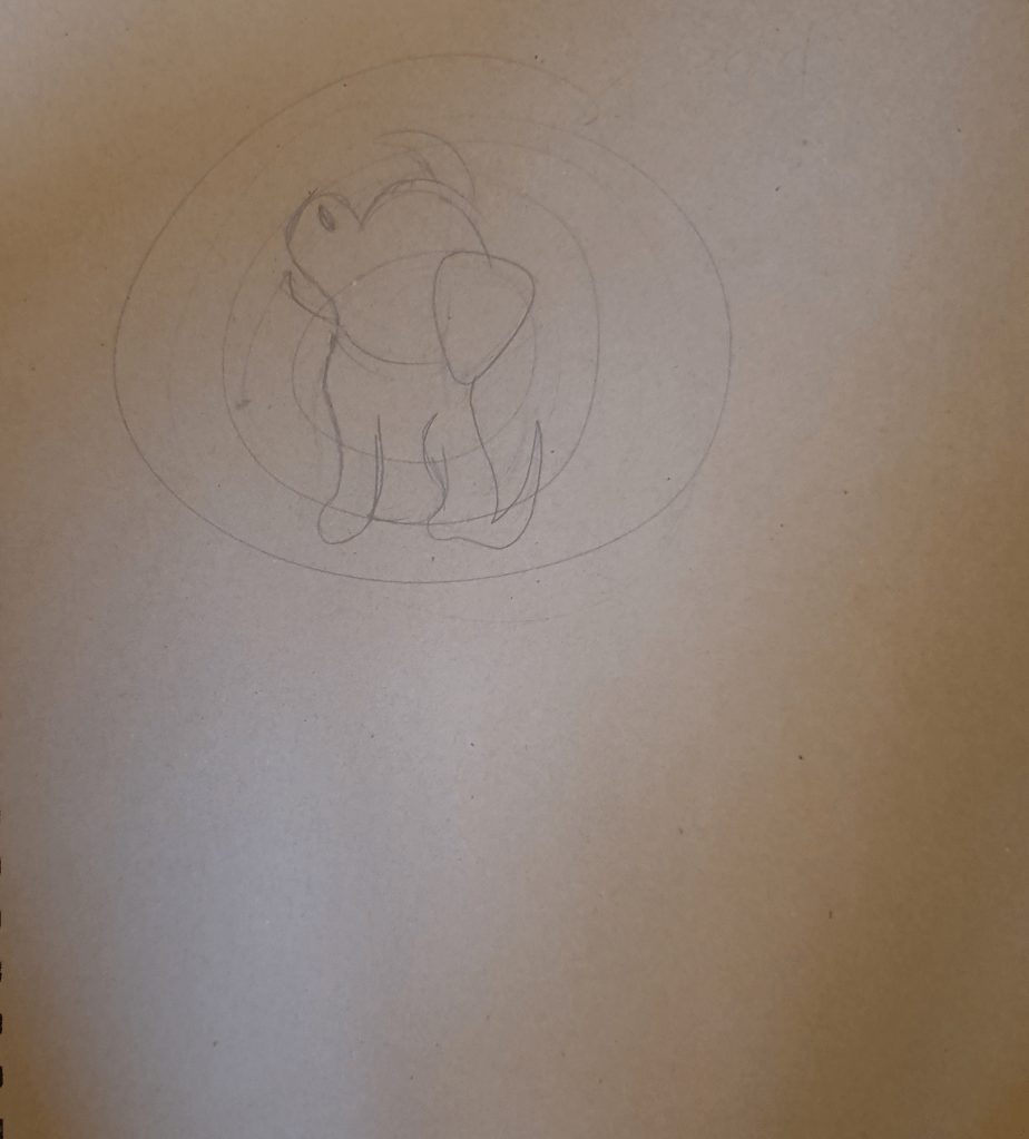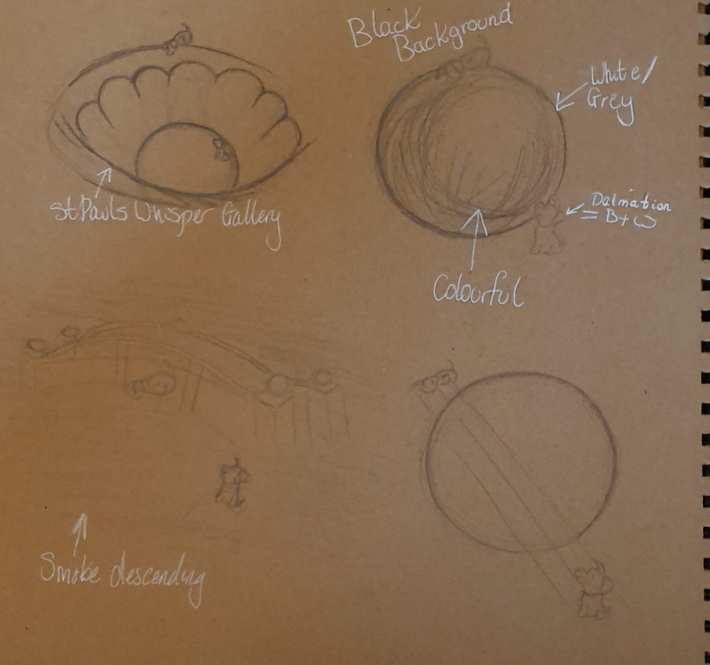 For this piece I decided to use a more muted and restricted palette. I was originally planning to use white for the dog but when viewing it I felt that this made the piece look unfinished and like it had a big blob of negative space as the centrepiece, which wasn’t a good look. I eventually decided upon a cream/beige colour as it is a warmer, more soft and comforting colour. I felt that this added an intimacy to the piece, becoming a better representation of a whisper. The colour is also nearer to the paint used in St Paul’s Cathedral so became a better fit for the rings in the image and adds a more ancient feel to it.