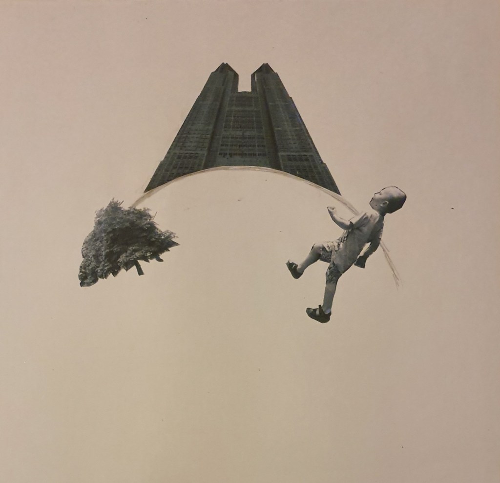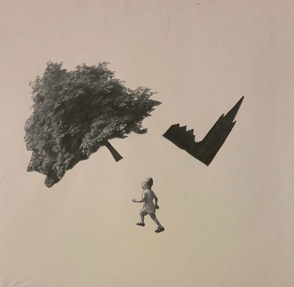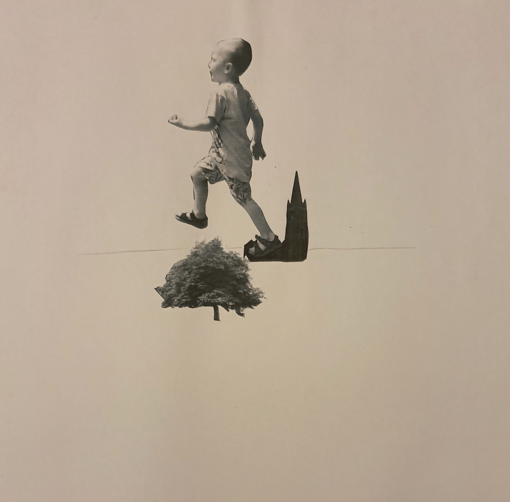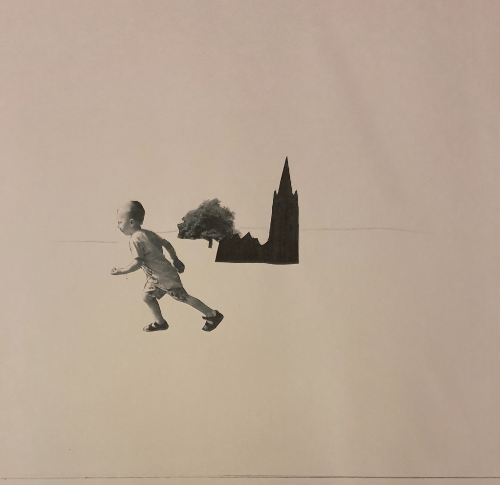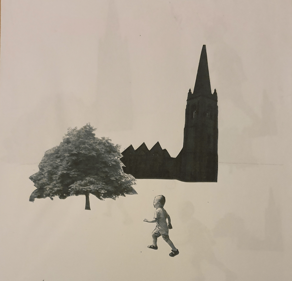 For this image I wanted the tree to appear further away so I picked a smaller cut out and placed it further up the paper, behind the church. I used a bigger cut out of the boy and placed him in the foreground to add even more distance. I tilted him so that he seems to be moving faster.