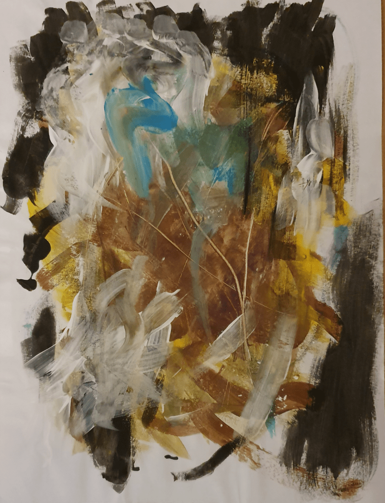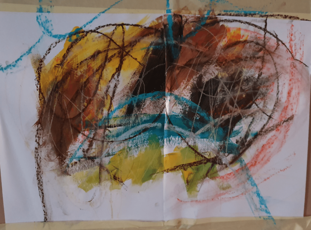 I felt that the second attempt was way more successful. In the first image I used a range of materials, trying to vary the effects and textures made. Remembering to change material however stunted my ability to be intuitive so in the second image I only used paint as I felt that this medium allowed more room for experimentation. I did however scratch at the paint with some paper I had beside me to add a different texture. I used earthy and bright colours as that is the feel I get from the music.