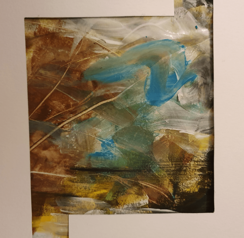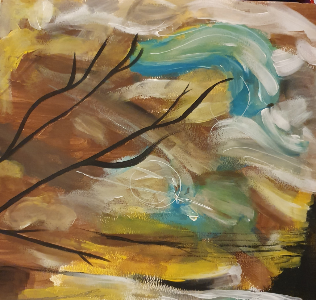 Here I reproduced the last image. I laid black paint over the top of the scratches to enhance the branch look. I felt that using black would give a silhouette look and also tie it in with the black on the opposite side, adding a sense of symmetry. I tried not to change the image too much from the original but brightened it up a little by adding more yellow and blue. The way I have applied the paint gives me a Van Gogh vibe, lending to the reading of the marks as the sky. These marks also help add to the natural, lively feel, and suggest movement. I liked the image this created, however it was at this point that I realised I had only used one type of media which doesn’t fulfil the brief properly, which I had to fix.