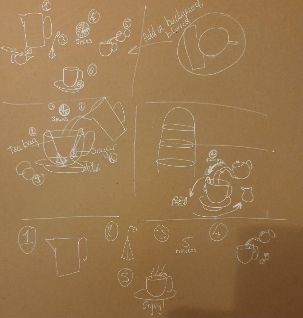 I didn’t feel that showing a person making a cup of tea would be the right way to go as I wanted the focus to go straight to the tea. I thought that having someone in the image would over crowd and over complicate the image.