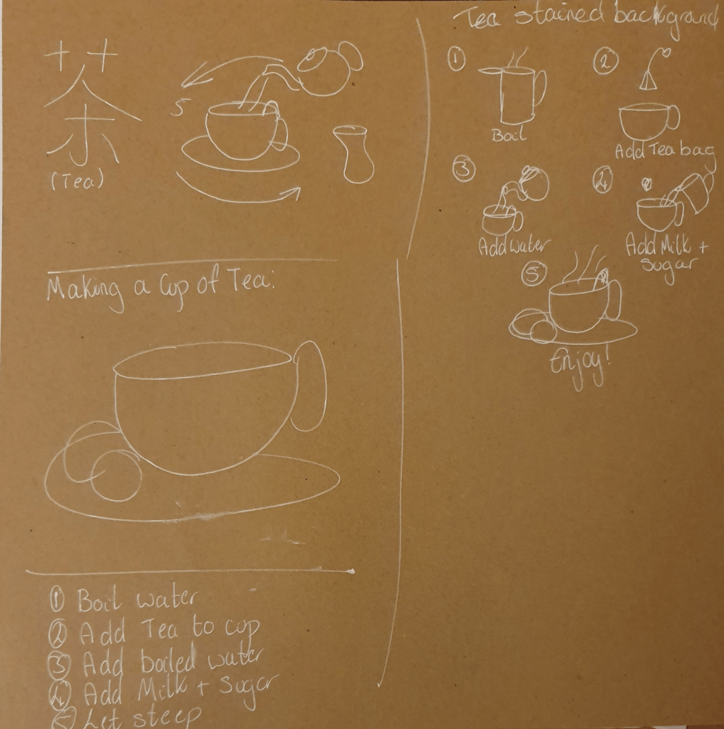 I was to then pick of these subjects to illustrate: making a cup of tea, getting to my house or playing a tune on an instrument. I chose making a cup of tea. To start I researched into the history of tea to generate ideas and themes behind the image. I did this because I didn’t want to create the usual boring looking straightforward manual. I then looked into the most used method of creating a cup of tea. There looks to be more steps than expected when laid out in front of me.