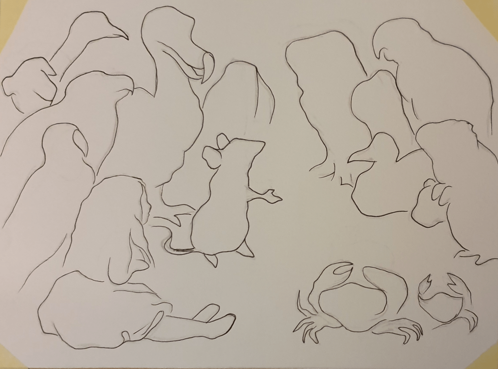 Enlarging the first image by 2.5 times its size to 22cm x 16.75cm I drew a line version of it. I did this twice to allow me to explore just how many lines and details are needed to communicate the image well.
