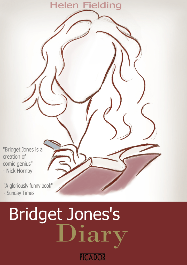 This is the design I went with. I felt that a more sketch like look loosened up the feel of the book. I chose to draw Bridget writing in her diary as this is what to book is based around and the format it is written in. I was originally going to have the drawing take up the whole cover but this didn’t look right. The image looked as though it was lost with some writing slapped on top of it. Because of this I had to rethink the design and anchor it somehow. I decided to add the diary at the bottom as a foundation. I did play around with changing the white background but didn’t think any other colour fit. Having the white background fits better as a representation of paper. I added shading around the edges to make the cover look less empty. I then added some colour to the pen and diary she is writing in to add some life to the image. This then off set the image so I added some shading to the face too. I faded the authors name and quotes on the side so that they wouldn’t draw attention away from the image. I wasn’t sure about the font but I knew that I wanted the word diary to have the same font that they usually do. This helped add to the red and make it look like her diary. I liked the contrast of the red and the white and felt that white font would tie the two part together. This is why her name is in white.