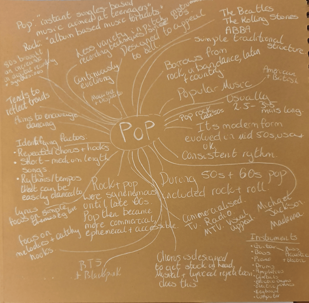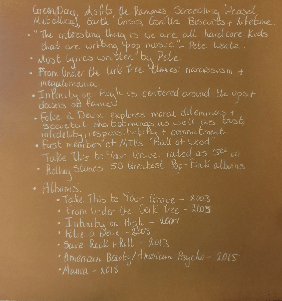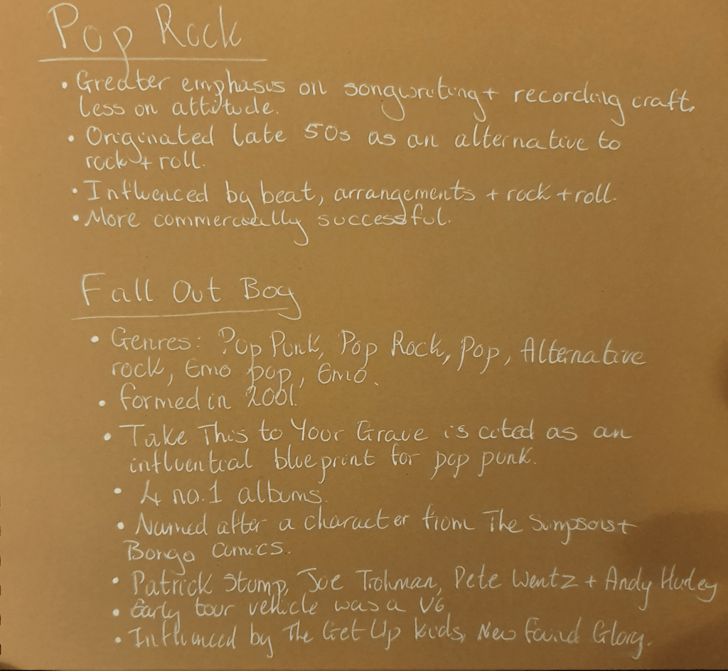 I ended up picking pop as this is an umbrella term and allowed me to use a pop rock group. I chose Fall Out Boy.