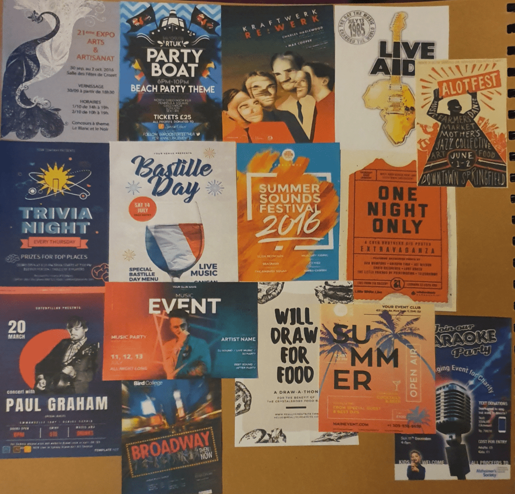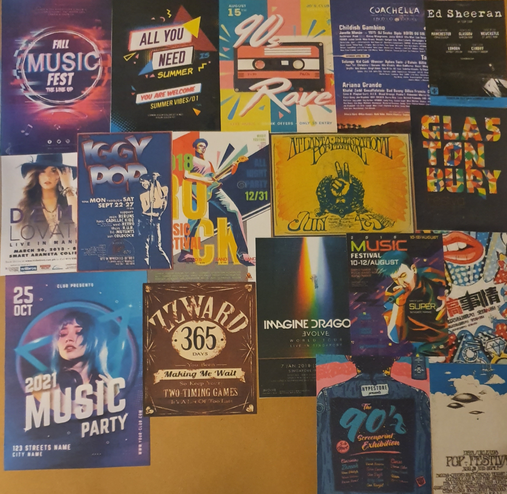 The posters I collected have told me that a simpler, less crowded image creates a better image. A less crowded image is gentler on the mind and allows it to processes the information easier. Bright colours are also a good way to draw attention. I like the contrast made between colours made in some of them as they make a striking image and it also works to tell the reader where to look. The “Alotfest” poster is also a good example of the use of perspective in a poster. The dark shape creates an interesting image and leads you straight to what you need to know.