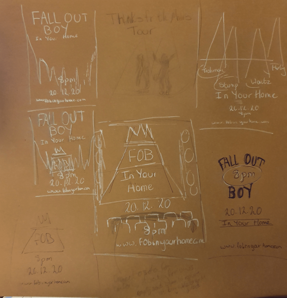 Instead of a more traditional venue I felt that since we can’t go to a concert at the moment because of coronavirus that a digital concert would be more fitting. I tried to think of a wide variety of designs using themes from their videos and songs.