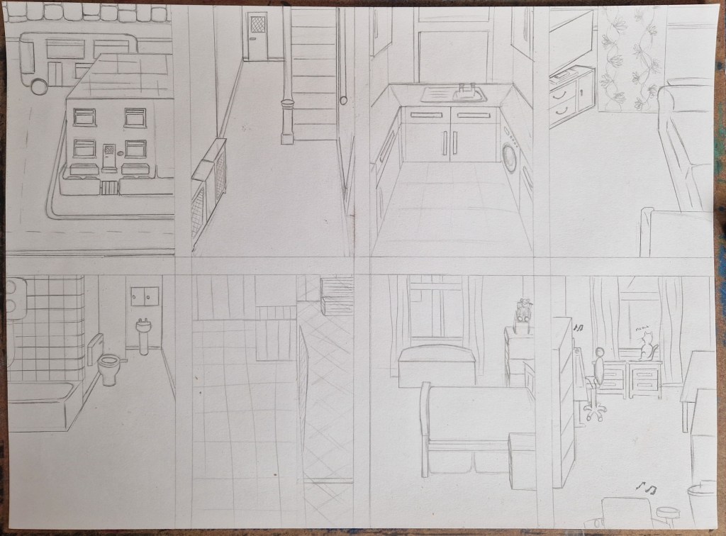 The perspective and scale in these images aren’t true to life however this being accurate wasn’t the point of the exercise. I did try to draw as much as I could remember. Some details may be slightly wrong. Some were left out as I couldn’t remember what was there, like which ornaments were on the shelves or which pictures were on the walls.