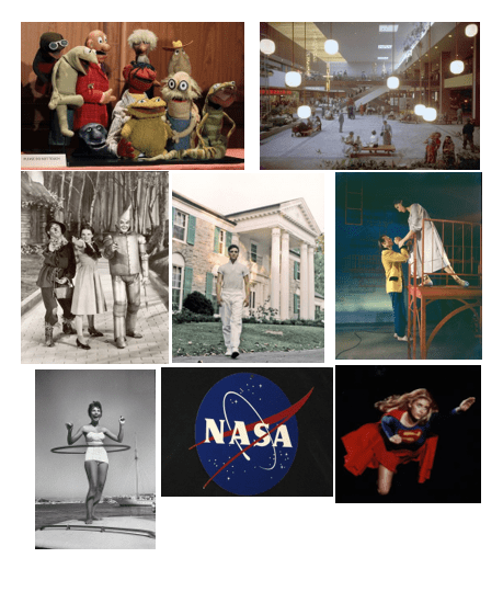 The 50s was overtaken by bright pastel colours. The era tried to hide any signs of the war that had just ended. Chic, glamourous clothing and bright, joyful imagery was used to gloss over the tragedies caused by the past 6 years. This was also a time of new technology, which could be seen everywhere. Enviable celebrities were all over the place, whether on tv, on the street or on the big screen. Luminescent signs could be seen on the streets. Golden haired beauties were in abundance. There were buildings inspired by space and cars that were sleek and beautiful.