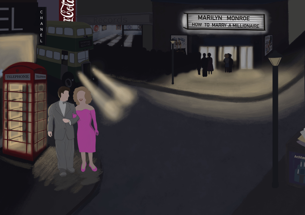 After this I had to create an illustration using the reference photos of 2 people on a street corner. The image also had to show elements of my chosen time period, the 50s.