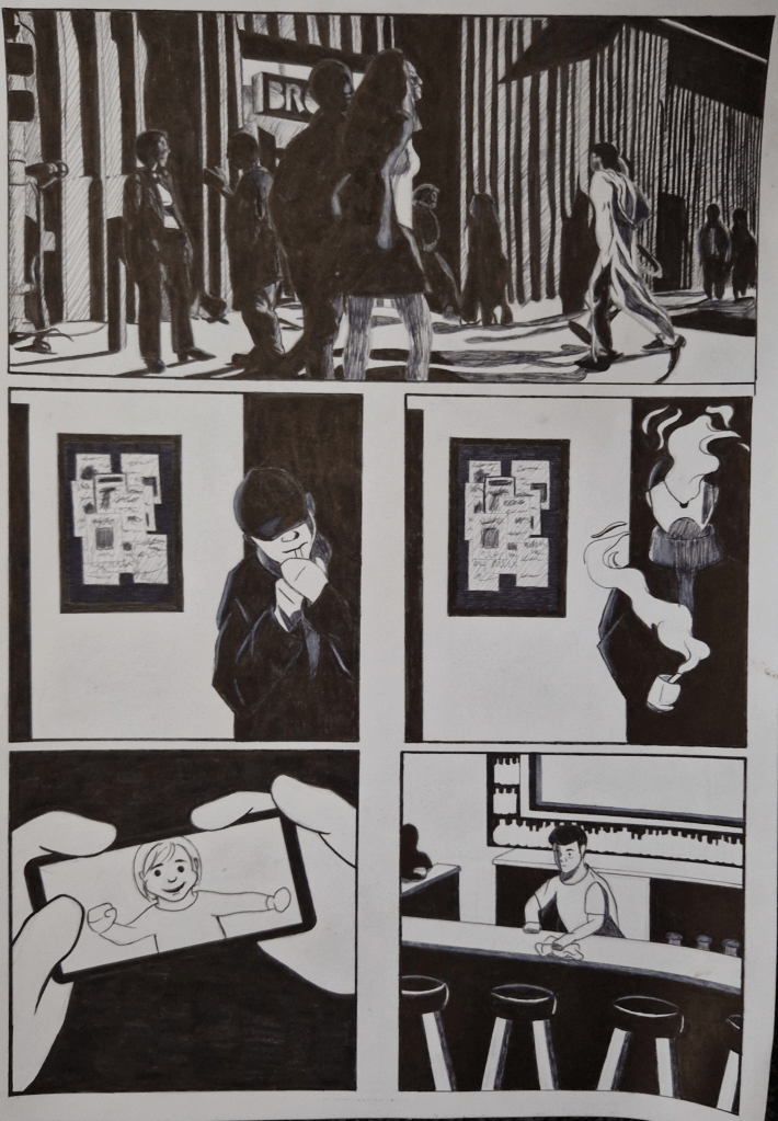 I wanted to make clear who the bartender is so the jump in the panels are the result of fitting some back story in. I started with him on his break. I feel that the fact that you see him smoking tells you a fair amount about his character and then the image of the toddler on the phone gives a bit of back story and knowledge about his life. I also wanted to show that he is tired, through the bags under his eyes, to add more context.